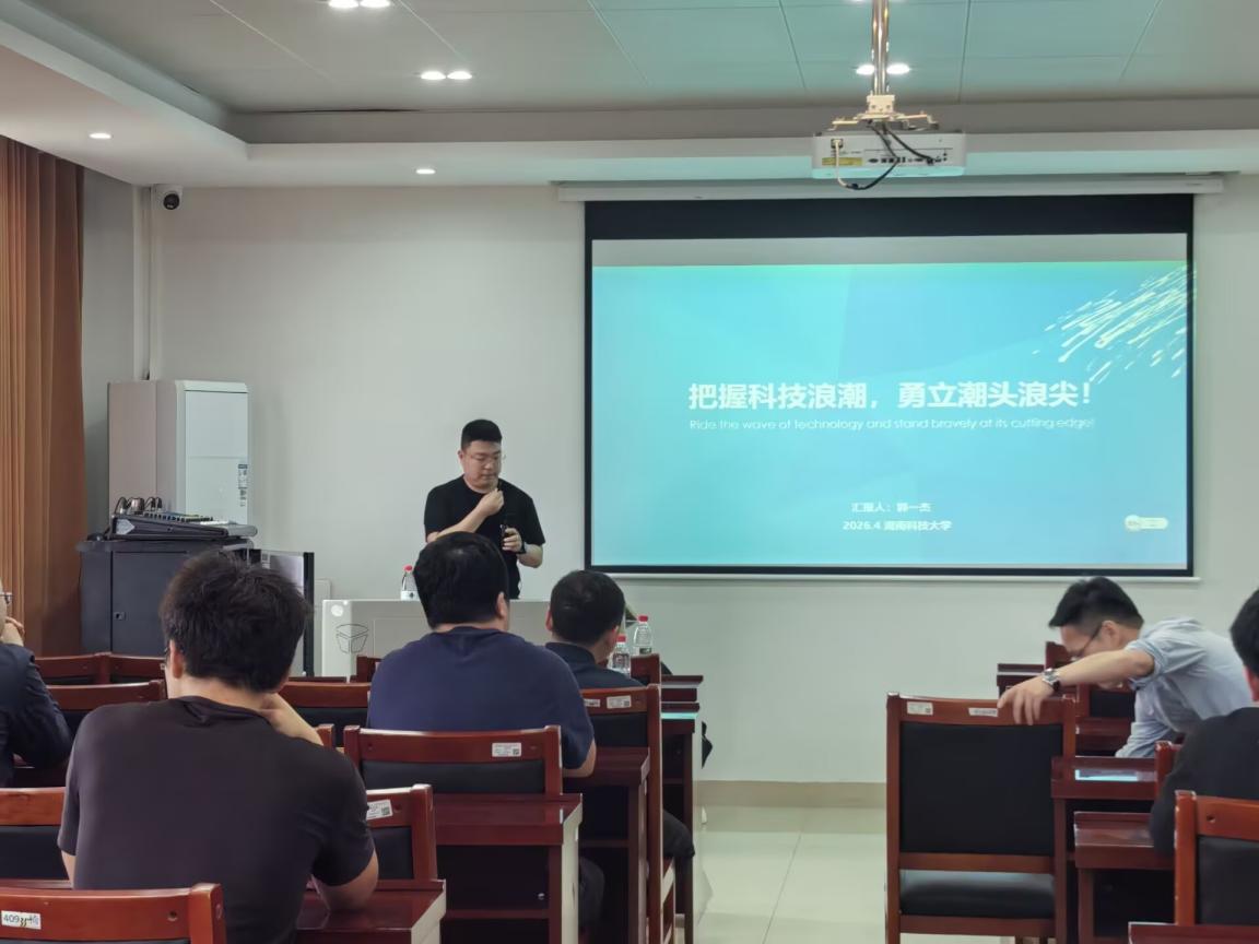 2026年4月10日,我校特邀 2011 级土木工程学院优秀校友、元宇宙产业应用开拓者郭一杰返校,开展智能科技与创新创业主题分享会,吸引百余位师生到场聆听。