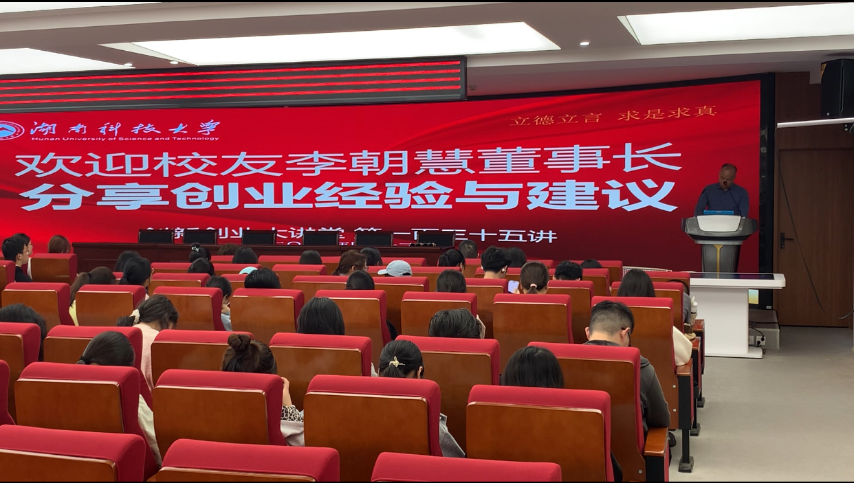 2026年4月13日下午,湖南科技大学创新创业大讲堂第135讲在立言楼举行。我校优秀校友、湖南立德曼服饰有限公司创始人兼董事长李朝慧重返母校,以“深耕服饰,筑梦前行”为主题,为现场200余名师生带来了一场精彩纷呈的创业经验分享会。