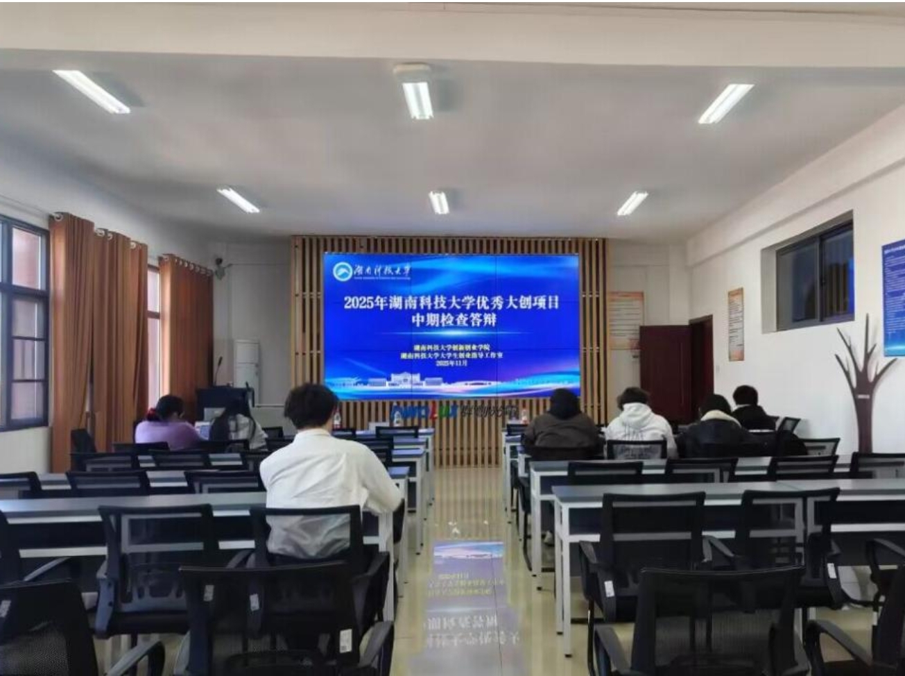 2025年11月25日下午,湖南科技大学优秀大学生创新创业大创项目中期检查答辩在敏行楼C405、C403教室举行。作为我校2025年大学生创业活动周系列活动,本次活动由学校创新创业学院与大学生创业指导工作室共同组织,采用“5分钟项目陈述+2分钟评委问答”的答辩形式,每组项目由三位评审专家进行综合评议。
